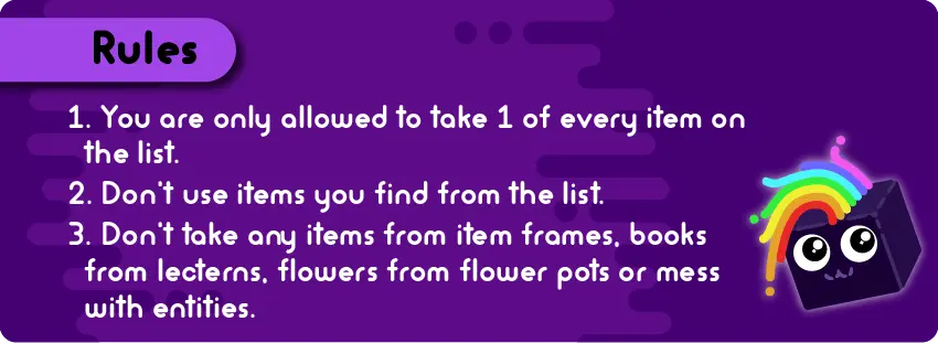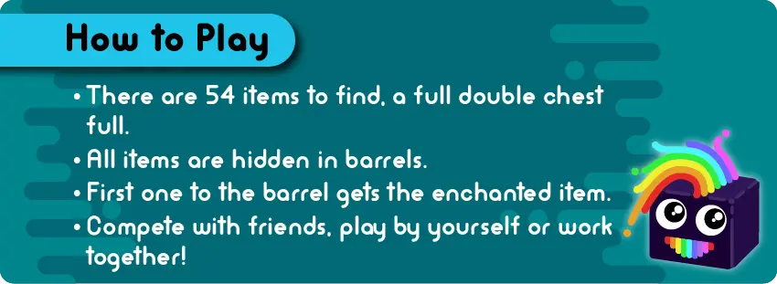 The rules are simple but brutal: each player can only take one copy of each listed item, and everything you’re looking for is tucked into barrels, not ripped out of frames or looted from lecterns. That means no griefing the builds, no stealing decorations, and no chugging your finds mid-run. If you spot an enchanted version of something in a barrel, grabbing that first really matters, because enchanted items become their own little win condition. One player might be quietly collecting normal items, while someone else snipes all the enchanted ones and swings the score their way.
