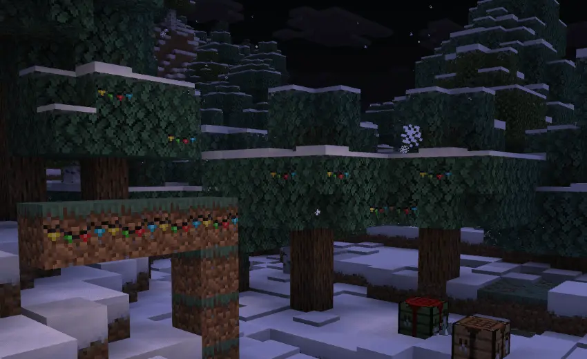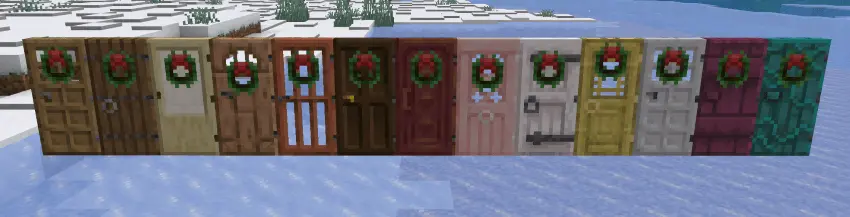 Winter Additions (Christmas Additions) Mod is basically you flipping the “permanent holiday season” switch on your world. Once it’s on, the overworld feels like it’s stuck in a snowy December: flakes falling from the sky, snow and ice scattered around, and that gentle winter vibe everywhere you walk. If you don’t always want full blizzard mode, you can tweak it with subpacks, but the core idea stays the same — your normal survival seed suddenly looks like a Christmas special. On top of that, some vanilla textures get swapped out: chests use the classic holiday console/Java look, and doors pick up wreaths so even basic builds feel decorated without you placing a single extra block.