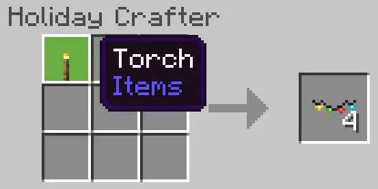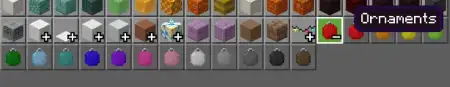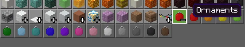 Decoration-wise, the addon gives you a bunch of simple tools that go a long way. Christmas lights can be placed like vines so you can outline rooftops, bridges, or tree lines and instantly make an area feel like a holiday street. Garland works in the same spirit, with a lit version that doubles as a light source so you don’t have to spam torches everywhere. Ornaments hang from blocks the way lanterns do, letting you dress up ceilings, tree branches, and porch overhangs. They’re cheap to craft too, using an iron nugget and any dye, so you can color-match builds without grinding rare stuff.
