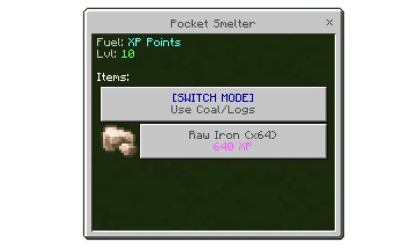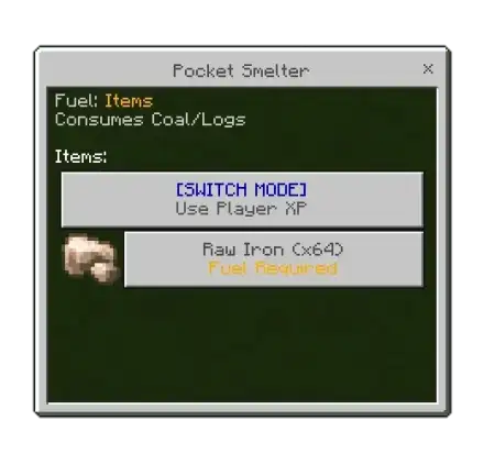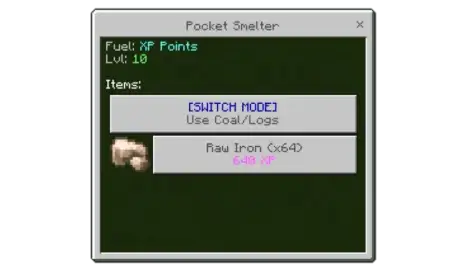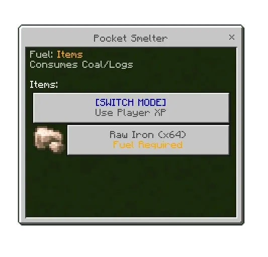 If you’re low on XP, Pocket Smelter Mod also has modes that let you run it on regular coal or wood instead. The only trick is keeping coal or wood in your inventory, because Pocket Smelter will automatically consume those resources to stay powered. That makes it feel more flexible in survival-style gameplay: if you’re deep underground or far from home, you can swap modes and keep smelting without stressing about your XP total. Pocket Smelter Mod ends up being a solid “stay in the flow” tool in Minecraft Bedrock—quick menu access, predictable smelt time per stack, and a power choice that fits whatever your run looks like that day.