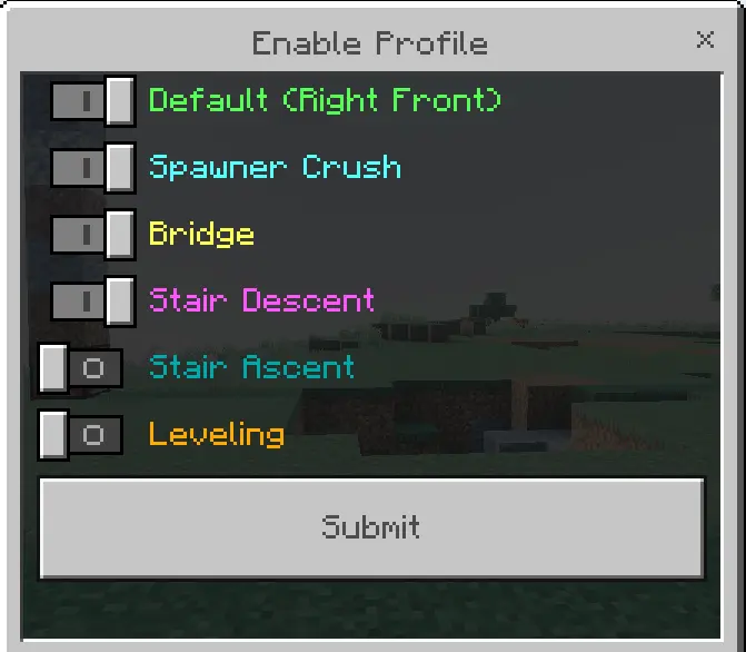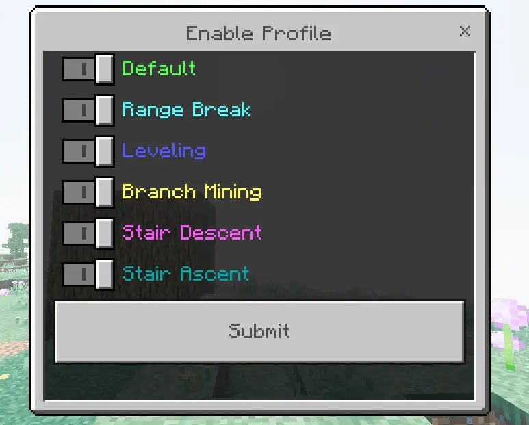 The included break profiles cover a lot of real survival routines. Default destroys adjacent blocks of the same type (default is 64 blocks), which is perfect for clearing logs, mining out a vein, or removing a wall fast. Range Break destroys blocks in an area (default 3x3x3), great for quick room carving. Leveling destroys blocks above the broken block for flattening terrain. Branch Mining mines in a straight line for ore searching. Stair Descent automatically mines downward stairs, which is basically a safer, faster way to dig down when you don’t want a messy hole.