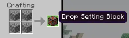 There’s also a drop control system using a crafted “Drop Setting Block.” You stack blocks you want to disable drops on top of it, and you can set presets for drop items with it. That preset is used with the “Item Drop Ignore” block destruction profile, which is super useful when you’re clearing junk blocks and don’t want your inventory flooded.