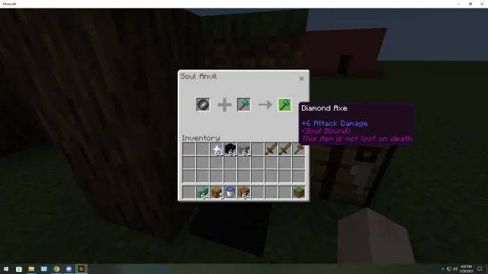 Here’s how it works: you’ll need to use the Soul Anvil, a special screen where you combine a soul stone with whatever item or piece of gear you want to protect. Once it’s bound, that item won’t drop when you die — it respawns right in your inventory. I tried it with my enchanted sword and diamond armor, and it saved me after a nasty fall into lava. Without soul binding, I’d have lost everything.