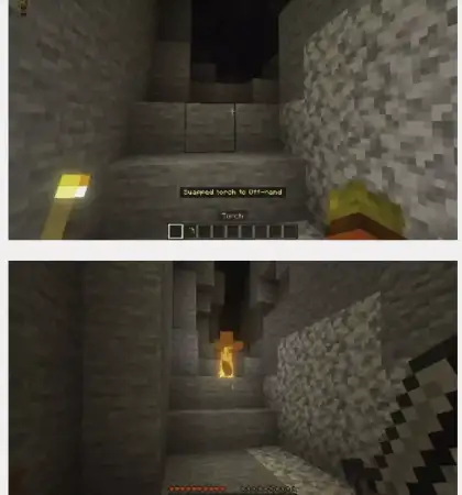 Real Dynamic Light Minecraft mod Off Hand and Main Hand, as well as dynamic lighting from mobs, fire, and objects that glow in the game.