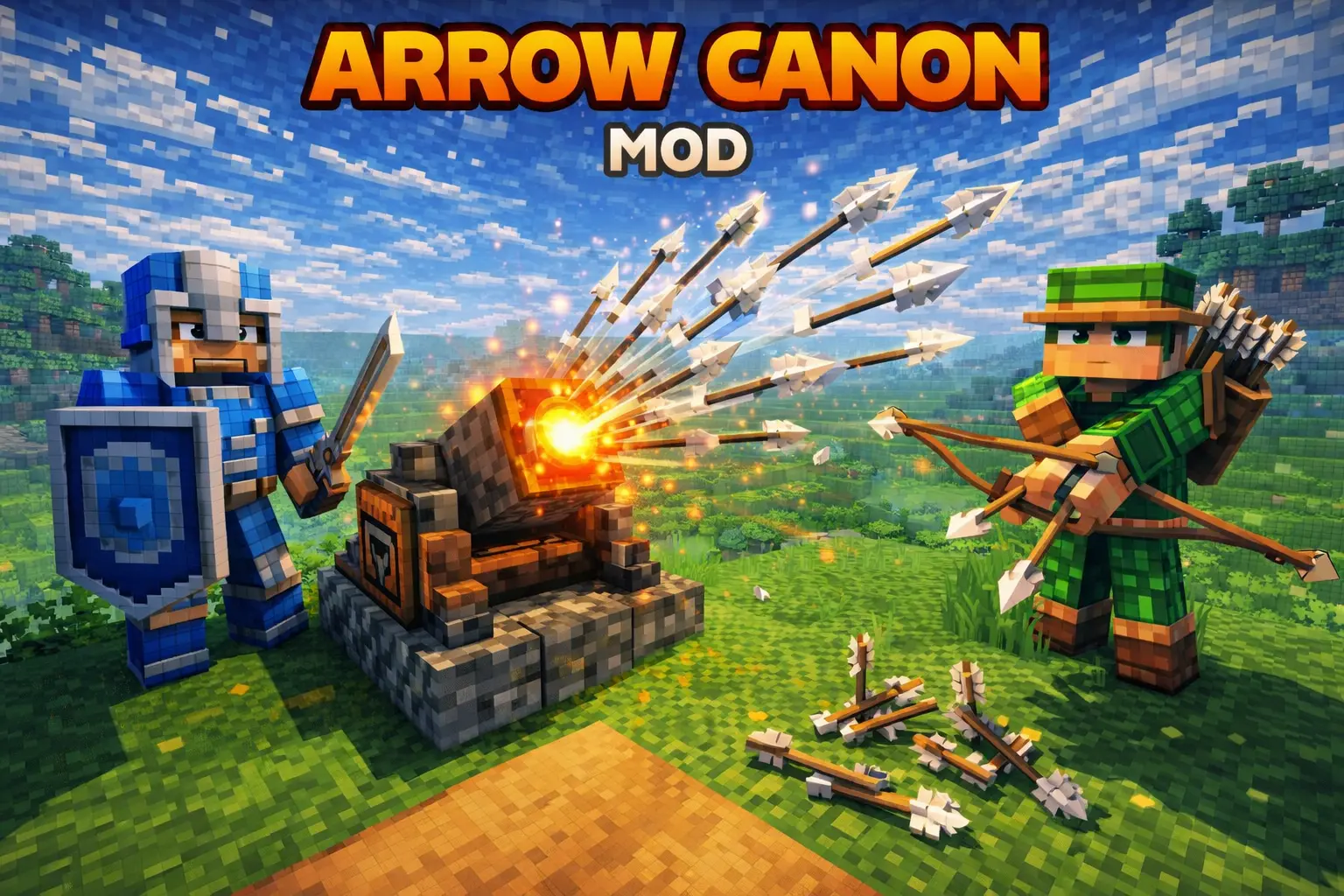 Arrow Canon Mod adds two configurable Script API weapons to Minecraft Bedrock—a “Sniper” (spyglass renamed to sniper) with an instant hitscan kill and optional recoil, plus an “Arrow Canon” (fishing rod renamed to arrow gun) that switches between Shotgun Mode and Rain Mode.