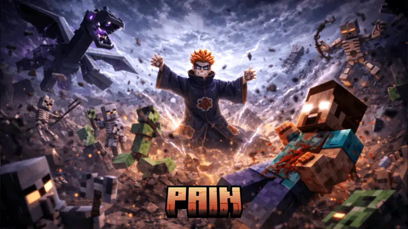 PAIN (Naruto Shippuden) Mod is a gravity-control combat kit where you use Deva Path to pull targets in with sneak, then flip into a push by unsneaking after the pull to blast everything back.