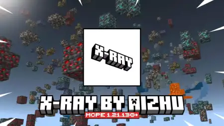 X-ray by Aizhu Mod is a Minecraft Bedrock resource pack that helps you find ores faster by making most underground blocks transparent while keeping all ores clearly visible with outlines.