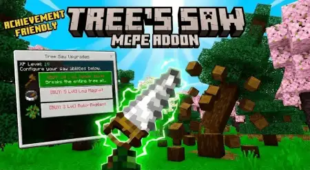 Tree Capitator Mod "break the whole tree with one click" lets you drop an entire tree by breaking a single log with an axe, and it smoothly clears the connected logs over time with smart detection and survival-focused safety limits in Minecraft Bedrock.