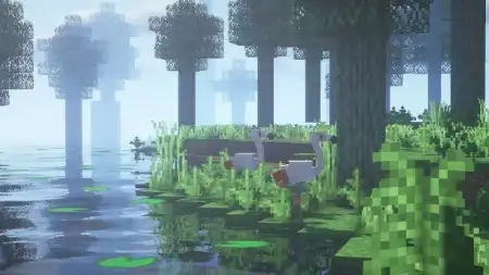 Out exploring, the water steals the show. Rivers and oceans throw clean reflections with gentle ripples, so an Elytra pass over a coastline looks downright heroic, and boat trips feel screenshot-ready the whole way. Foliage sways just enough to sell wind without turning forests into noise, and the color boost makes biomes pop—lush greens in jungles, warm sands in deserts, colder blues in high snow—while staying natural. Skies get the glow-up too: better clouds, better gradients, and that “okay I’m stopping to stare” sunset before you sprint home.