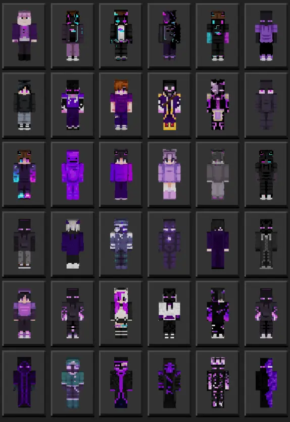 For PvP and minigames, the skins give instant team identity. Full purple-black squad on a Bedwars bridge? You’re unmistakable, and callouts stay crisp when fights get messy. City maps and hub builds also benefit: patrol a portal plaza in matching Ender fits, stage “dimension guard” role-play, then hop to parkour or arena nights without changing the theme. Swapping is quick in the dressing room, so you can match your role to the plan in seconds.