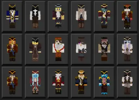 Pirates Collection Skins — a sea-wolf wardrobe that makes every Minecraft Bedrock session feel like you just stepped off a creaking deck with salt in your hair and a map in your pocket. The palette does the heavy lifting: royal purples for captain energy, blue tones that read clean against ocean horizons, and green accents that pop under lantern light. Throw one on and suddenly a normal world seed turns into a coastline to chart and a rumor to chase.