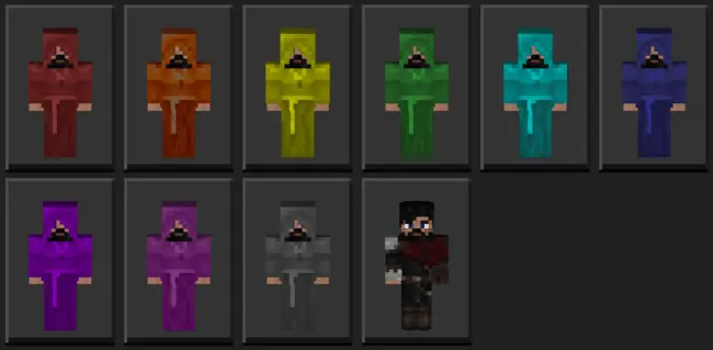 In survival, the robes make organizing your crew painless. Call roles by color and the team basically labels itself—blue handles scouting, green farms, red leads raids—no extra chatter needed. On servers, they double as instant uniforms for Bedwars/SkyWars or quick parkour races; you line up at spawn, everyone locks a different robe, and the screenshots already look coordinated before the countdown starts. For role-play, it’s effortless: run a mage college, a city guard with color divisions, or a traveling troupe that changes robes to match districts and festivals. The palette snaps into most builds, so you never clash with the scene.
