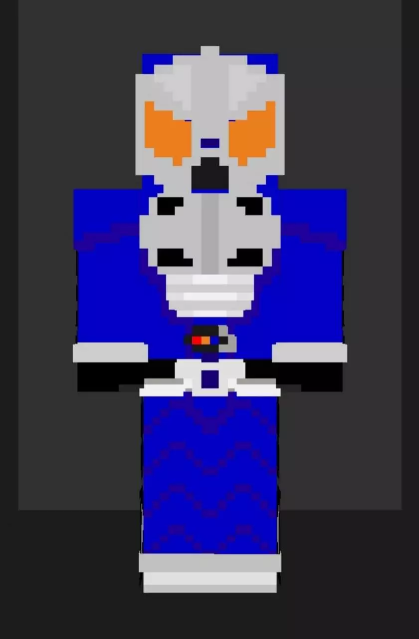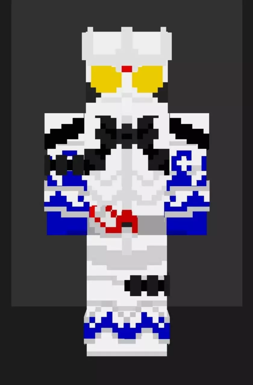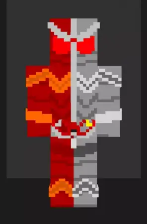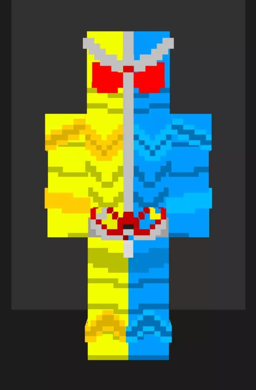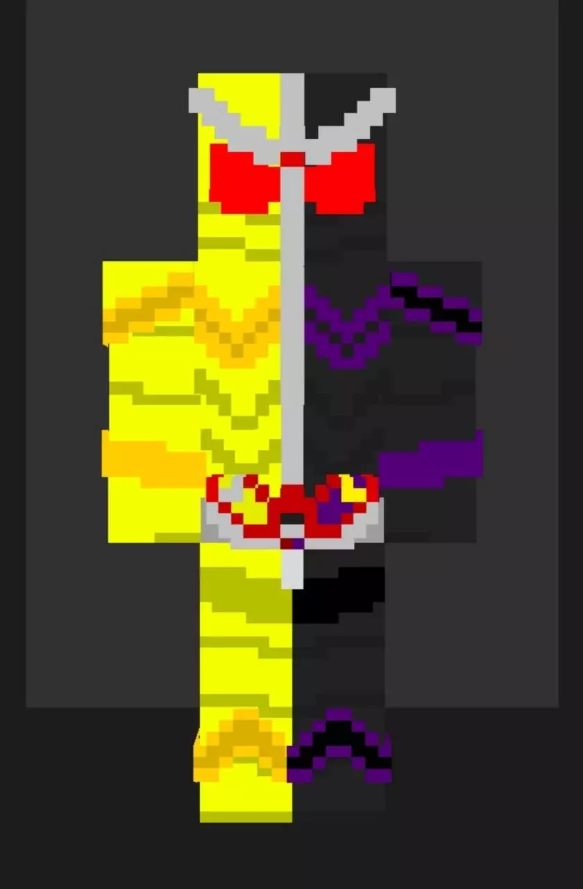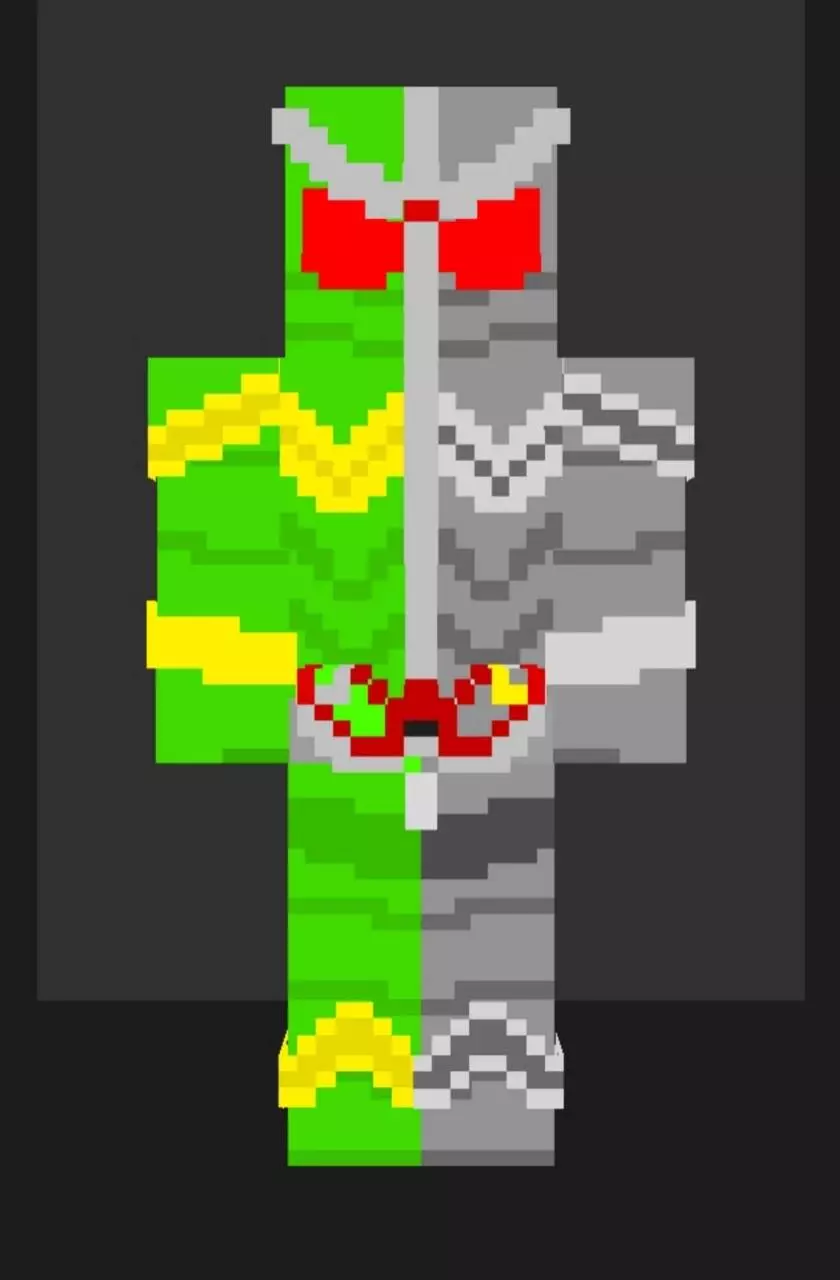 Kamen Rider W (Double) — two minds, one body, translated into Minecraft Bedrock skins that pop the moment you load in. The pack centers on W’s signature split look, echoing Shotaro on the right and Philip on the left, with form cues drawn from Cyclone, Heat, Luna, Joker, Metal, and Trigger. It reads instantly in motion: that vertical divide gives you a crisp outline when you sprint across rooftops or cut through a village raid, so your team always knows who’s making the play.