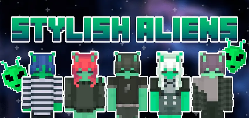 Stylish Aliens Skin Pack includes 5 alien-themed skins for both girls and boys, giving you a clean sci-fi look that stands out in Minecraft Bedrock. Stylish Aliens Skin Pack is great if you want a more futuristic character vibe without going full goofy costume.